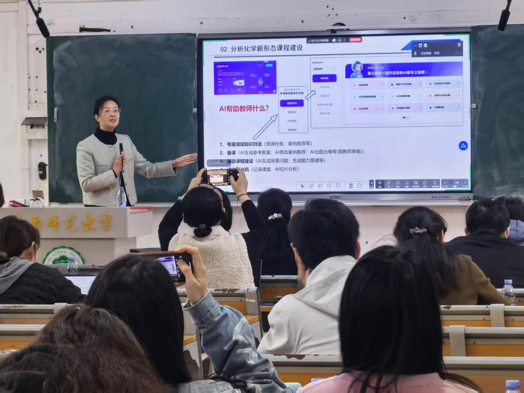 工作坊邀请了湖南大学博士生导师、岳麓学者特聘教授宦双燕教授做题为《数智赋能分析化学新形态课程建设与教学创新》的专题报告。宦教授通过介绍分析化学新形态智慧课程的建设思路、建设成果,并依托分析化学新形态课程进行跨校数字教材建设的建设经验,为与会教师分享了数智赋能分析化学的教学创新应用和改革成效,并对未来AI赋能星空彩票在线登录下载工作进行了展望。