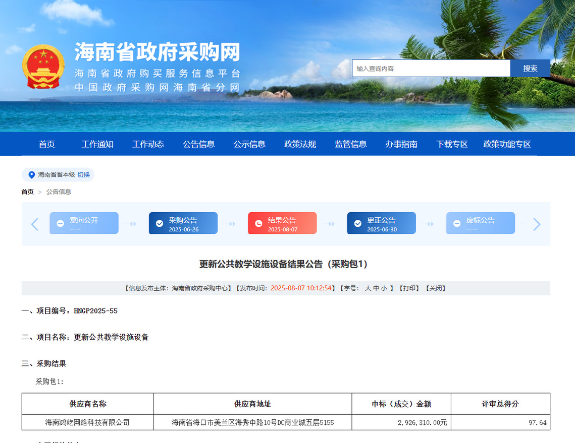 公告链接:https://www.ccgp-hainan.gov.cn/maincms-web/articleHn?type=notice&id=ce996481-fd58-42ab-b873-31779e12b007&planId=8a1d16c297116291019714da4cf101de