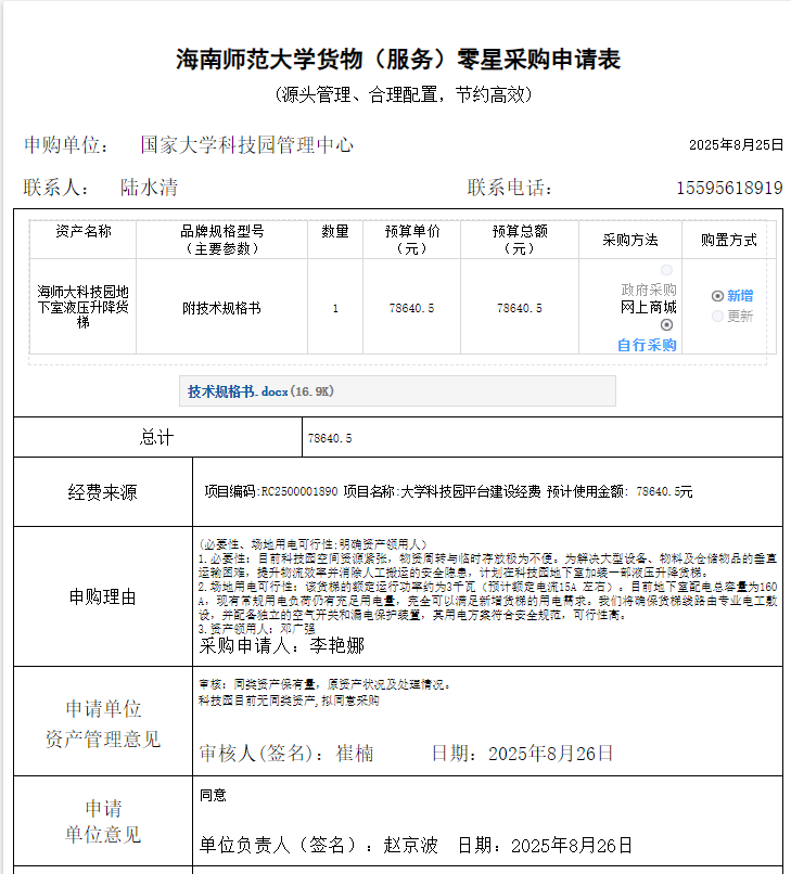海师大科技园地下室液压升降货梯项目采购申请表