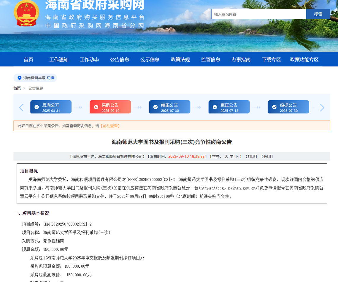 公告链接:https://ccgp-hainan.gov.cn/maincms-web/articleHn?type=notice&id=95862628-5848-4320-87b3-8c808d222d45&planId=8a1d16dd97d83d960197e2a61c4f00db&channel=c5bff13f-21ca-4dac-b158-cb40accd3035