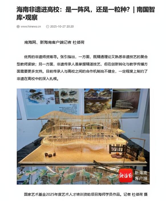 10月27日,南海网以《海南非遗进高校:是一阵风,还是一粒种?》为题,报道海南非遗项目走进多所高校课堂。其中,报道了我校利用国家一流本科课程“建筑模型制作与工艺”,让学生通过复原并创新船型屋模型,深度理解黎族传统民居的营造智慧,我校非遗教育人才培养模式,以及非遗教育面临的现实难题和破解之道。