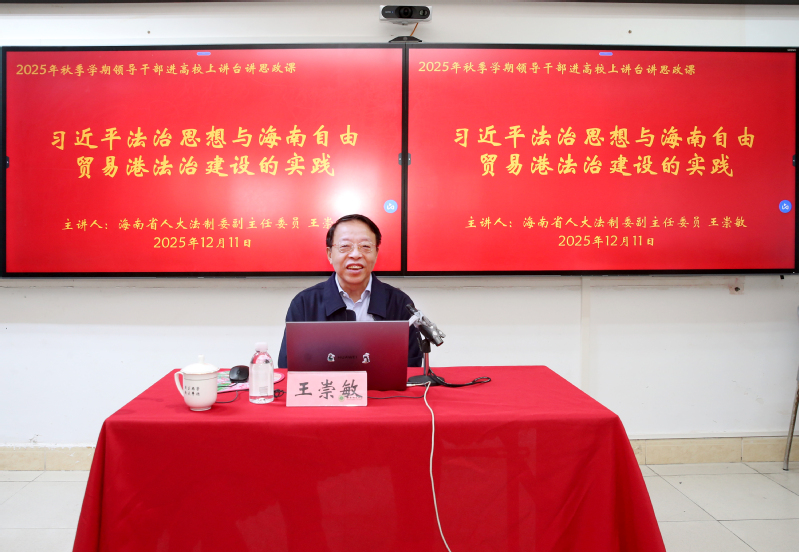12月11日上午,海南省人大法制委副主任委员王崇敏到我校龙昆南校区,讲授题为“习近平法治思想与海南自由贸易港法治建设的实践”的思政课。思政课由机关党委书记主持,160余学生到场学习。