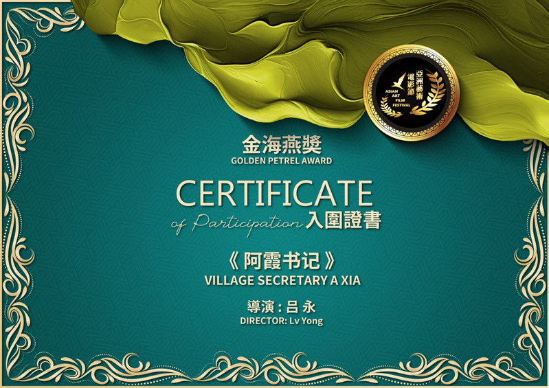 《阿霞书记》入围第二届亚洲艺术电影节“金海燕”奖证书