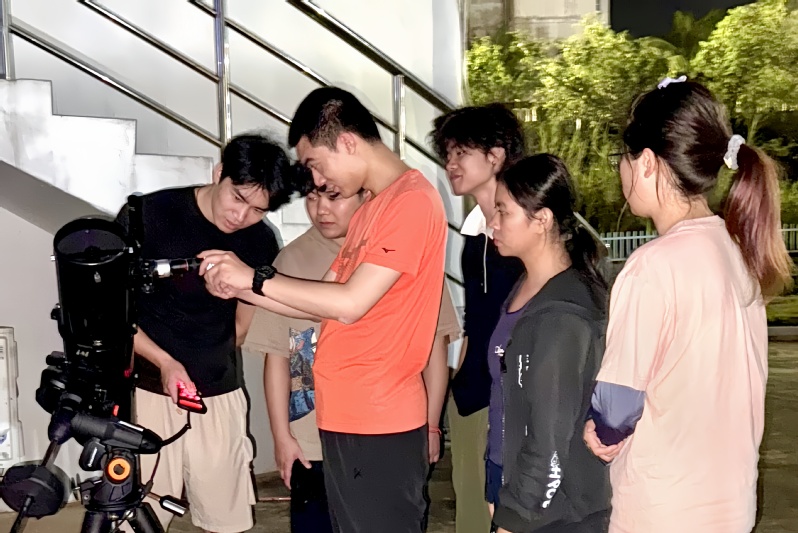 在龙昆南校区椰林广场,校艺术团声乐团以“清歌雅韵,回响椰风”为主题开展表演。声乐团成员演绎了多首风格各异的流行曲目,用歌声传递青春感悟。孩童们积极参与歌曲互动,为活动增添了别样的文化氛围。在桂林洋校区图书馆门前,晴天文社开展了“守护星夜,邂逅银河”主题活动。社团成员利用专业观测设备,指导同学们观察星空、学习器材操作,普及光污染防治与星空保护知识。活动最后,大家共同写下心愿,布置成星空许愿墙,为科学探索注入人文情怀。