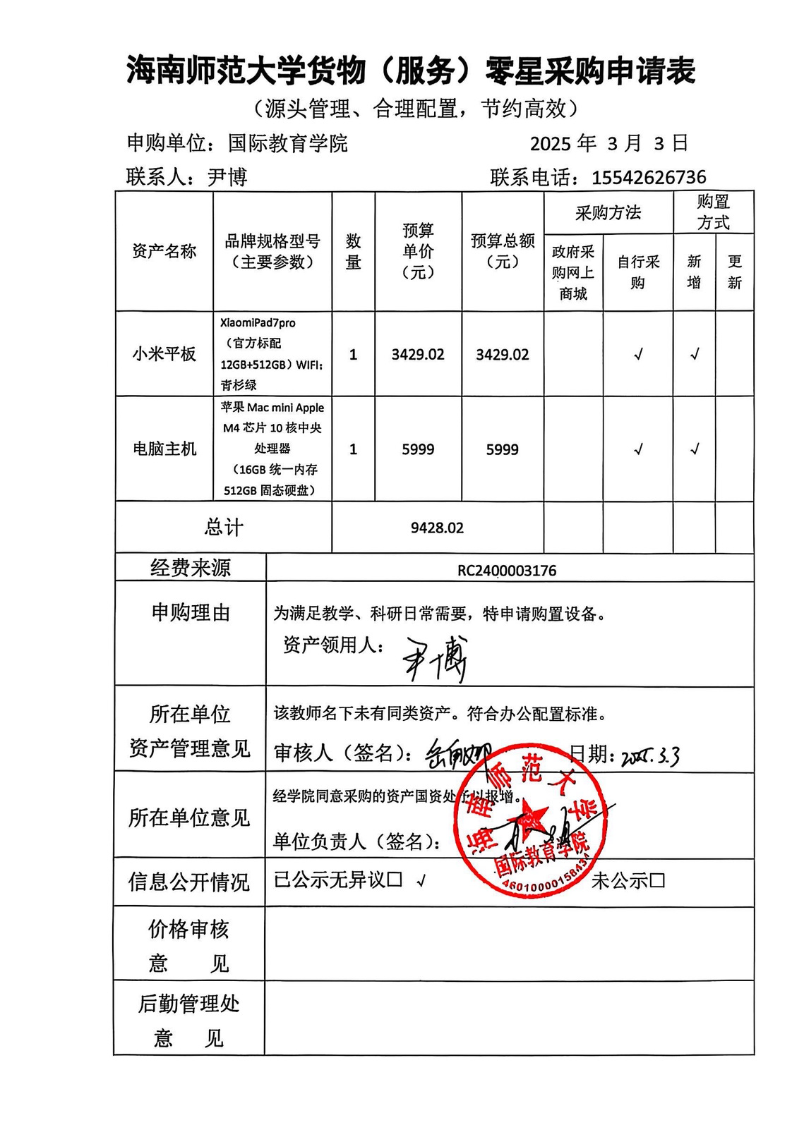因教师科研、教学日常需要,我院教师特申请购买小米平板一部、电脑主机一部。经费来源为博士科研启动项目经费(RC2400003176)。