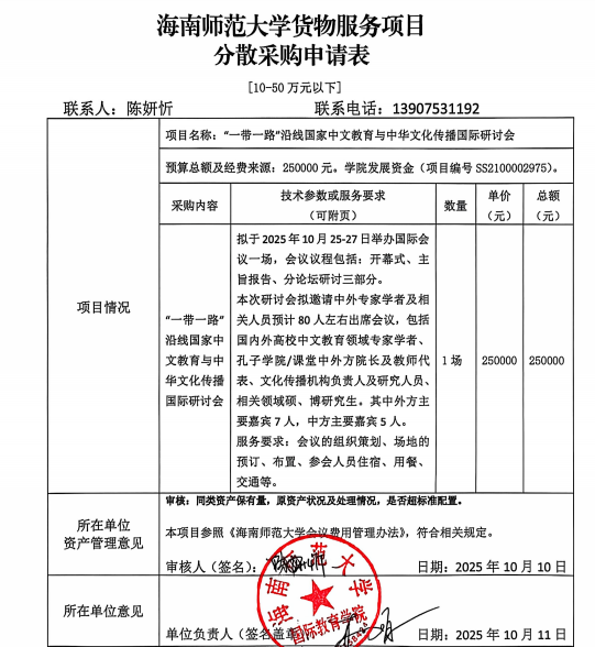 为贯彻落实“一带一路”倡议实施十周年的重要精神,推动国际中文教育高质量发展,提升中华文化国际传播能力,我校拟于2025年10月25日—27日在海口市举办“一带一路”沿线国家中文教育与中华文化传播国际研讨会。现将服务采购公示如下,公示期3天。如有疑义,拨打办公电话:65882015。