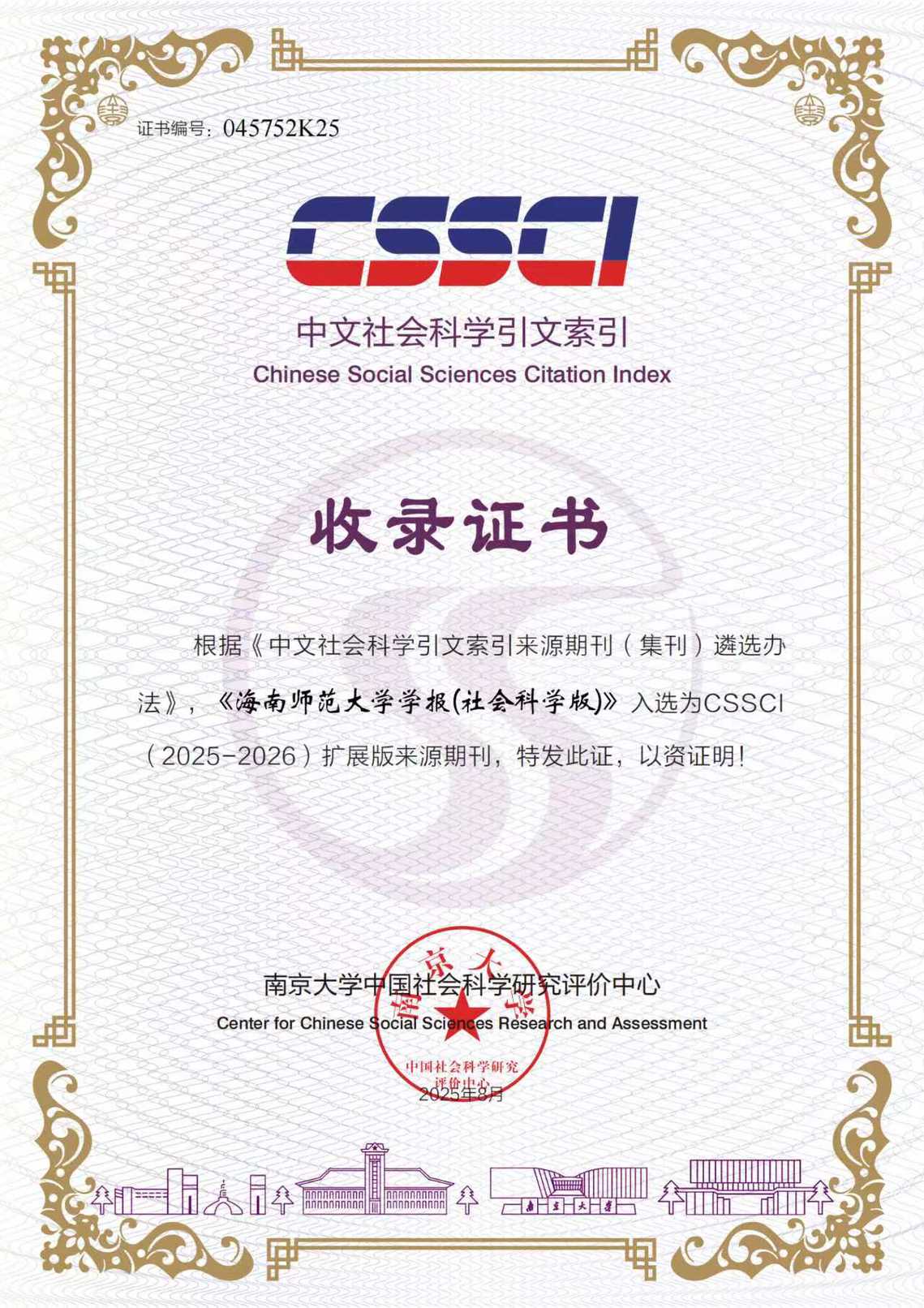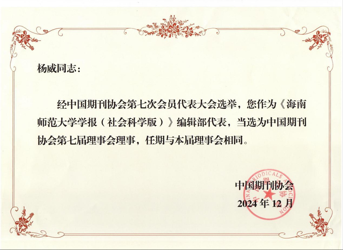 近日,南京大学中国社会科学研究评价中心正式颁发CSSCI来源期刊(2025-2026)收录证书,《海南师范大学学报(社会科学版)》首次入选CSSCI扩展版来源期刊。近年来,我校将学报“力争步入核心期刊”的建设任务列入《海南师范大学“十四五”发展规划》,精心谋划,加大投入;锚定方向,踔厉奋发。编辑部陆续推出增设“国际中文教育研究”专栏等诸多办刊新举措,积极探索符合数智时代发展要求的新思路新方法,不断强化期刊的规范化、专题化、品牌化建设,紧紧围绕“马克思主义与当代中国”“国际中文教育研究”“20世纪中国文学研究”“海南自由贸易港建设研究”“海南历史文化研究”“东坡居儋思想文化研究”“海南方言研究”