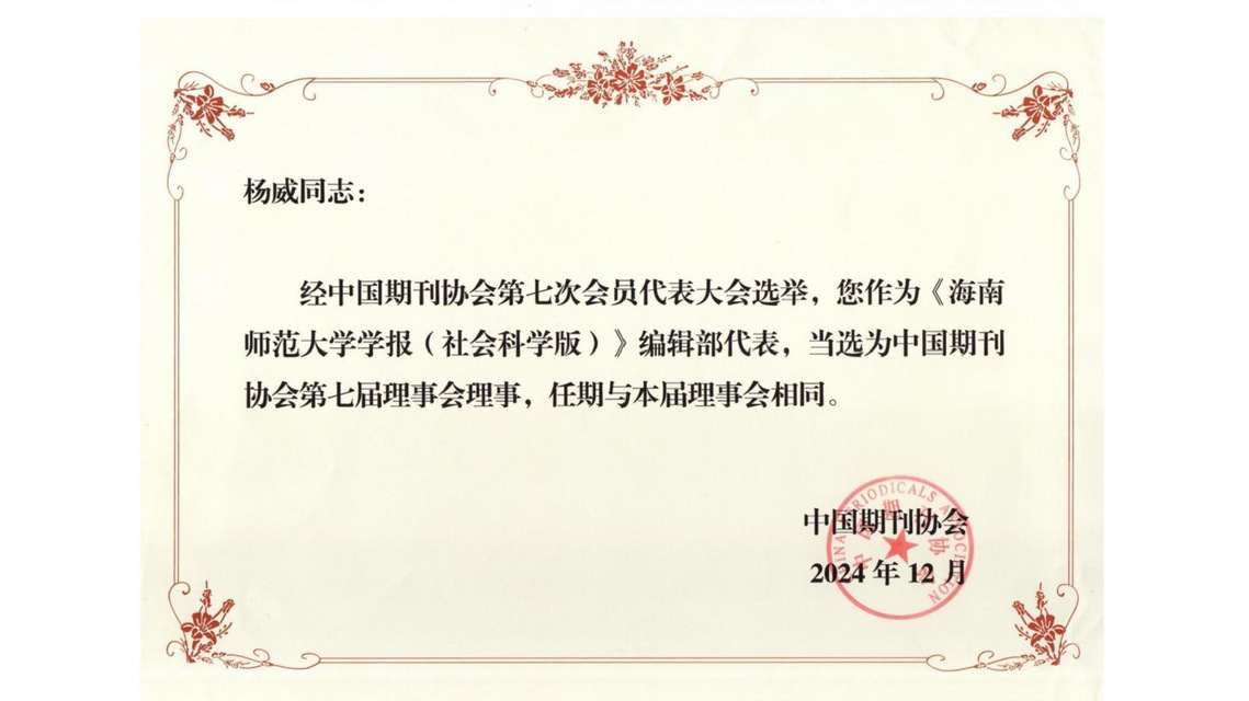 2024年12月28日,中国期刊协会第七次会员代表大会在北京举行。经此次会员代表大会选举,《海南师范大学学报(社会科学版)》主编杨威教授当选为中国期刊协会第七届理事会理事,任期与本届理事会相同(五年)。