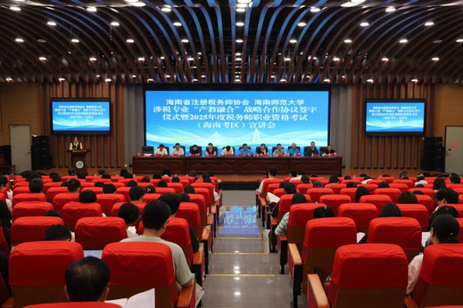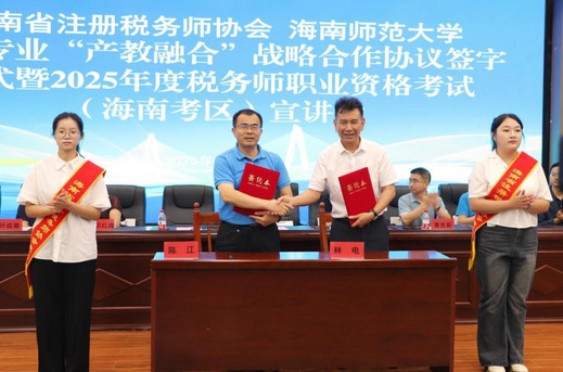 5月15日下午,我校与省注册税务师协会涉税行业“产教融合”战略合作协议签字仪式暨2025年度税务师职业资格考试(海南考区)宣讲会在桂林洋校区图书馆一楼学术报告厅顺利举行。省注册税务师协会会长林电,省注册税务师行业党委专职副书记欧阳红梅,省注册税务师协会副会长郭克刚,副秘书长杨大校、付仕仿,省注册税务师行业党委委员董峰;我校经济与管理学院院长陈江,党委副书记陆娜,副院长叶成徽,税收学系主任曹胜新出席会议。会议由付仕仿主持,来自我校经济与管理学院大三、大四学生和13家税务师事务所代表,共计350余人参会。