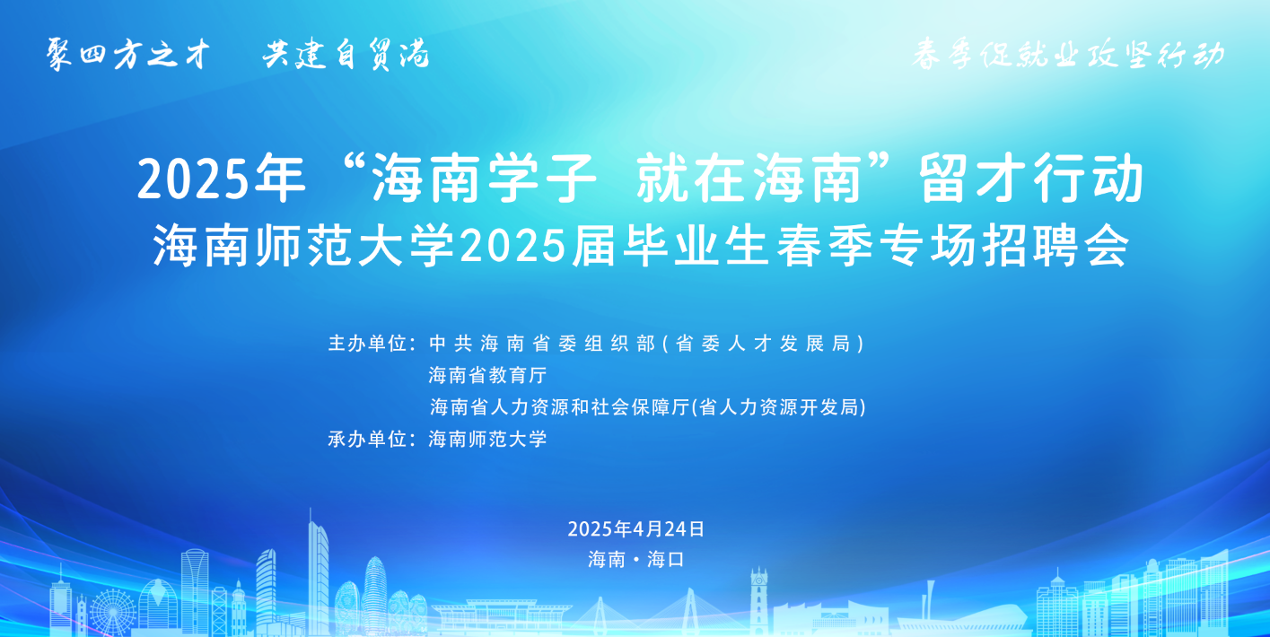 为贯彻落实党的二十大精神,深入推进海南省委、省政府“聚四方之才 共建自贸港”招才引智进校园工作,抢抓高校毕业生就业关键期学校将于4月24日(星期四)举办海南师范大学2025届毕业生春季专场招聘会,现将具体事宜通知如下: