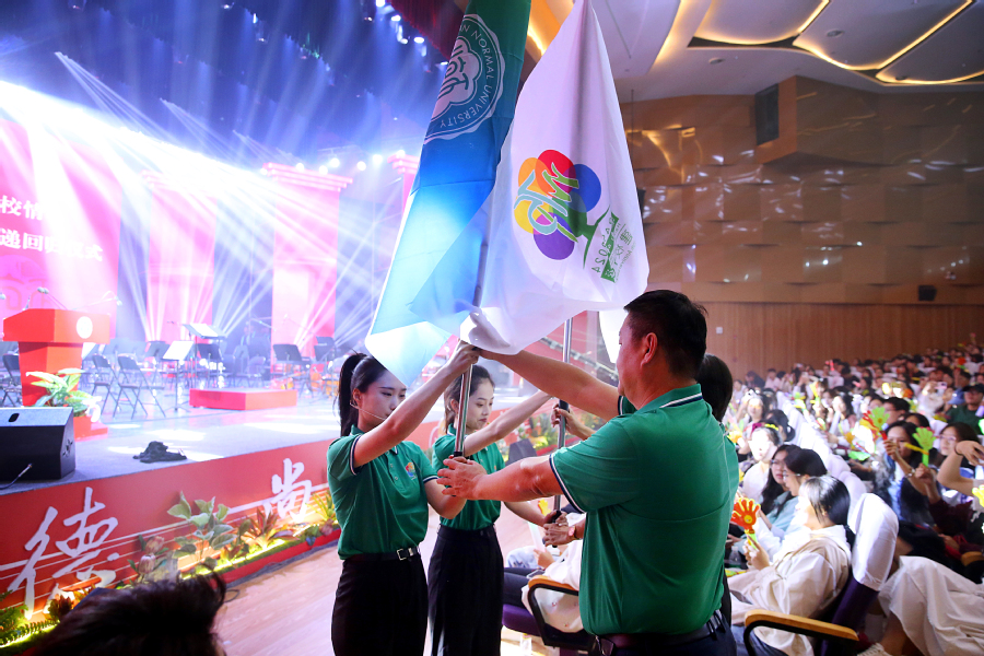 会场内张灯结彩,洋溢着喜庆的气氛。大屏幕上播放各地校友会传递校旗的视频,来自天南海北的祝福展现了一代代海师人“爱满天涯”的精神传承。历时1个月,星空游戏官方校旗途经14个省、18个市县、2个特色校友分会传递,终于回到晚会现场,本科生、研究生代表庄严地接过校旗,完成了校旗传递回归仪式。