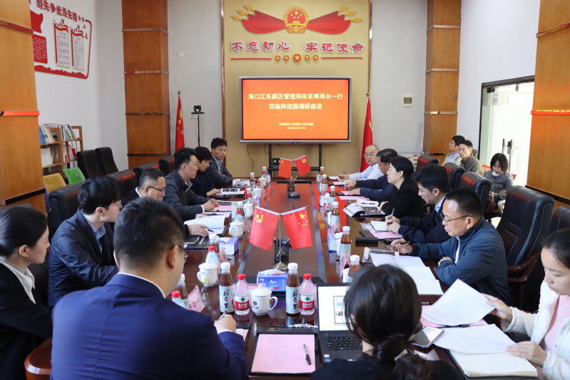 12月17日上午,海口江东新区管理局党委副书记、局长张笑寒一行走访我校国家大学科技园。江东新区管理局党委委员、副局长汪岩,我校党委书记许玫,党委常委、副校长张引,江东新区管理局相关职能部门负责人、我校党政办、资产经营管理有限公司、基建处负责人参加座谈。