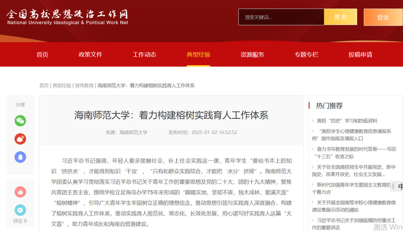 12月25日,全国高校思想政治工作网“典型经验”板块专题报道我校着力构建榕树实践育人工作体系《星空游戏官方:着力构建榕树实践育人工作体系》。