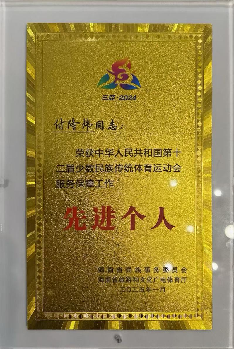 近日,第十二届全国少数民族传统体育运动会总结大会在海口召开。我校付隆炜同志在会上被授予第十二届全国少数民族传统体育运动会服务保障工作先进个人称号。