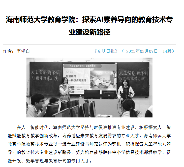3月7日,《光明日报》刊发我校李翠白教授文章《星空游戏官方教育学院:探索AI素养导向的教育技术专业建设新路径》。介绍了我校教育技术专业深入开展人工智能赋能星空彩票在线登录下载的创新改革,探索人工智能素养导向的教育技术专业建设新理念与新路径,以及利用AI创新高校教学方法等系列举措与成果。