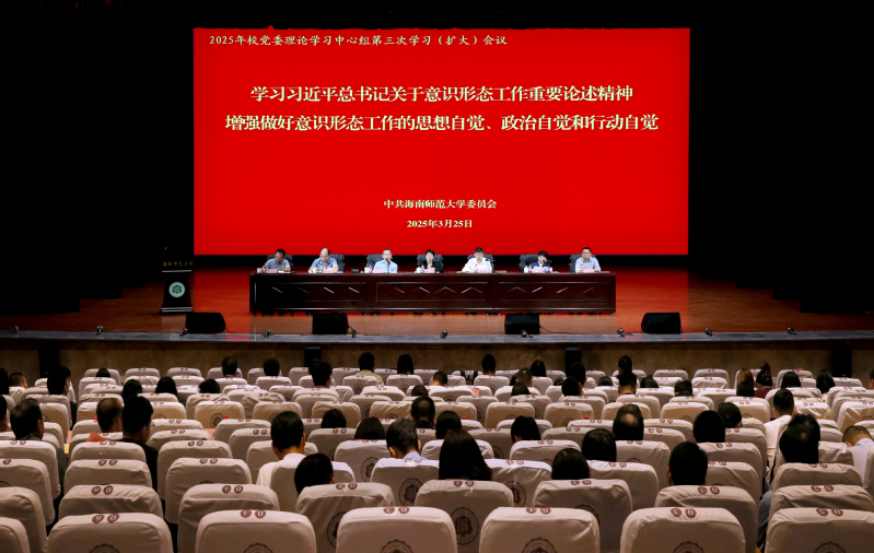 3月25日下午,我校在桂林洋校区大学生活动中心演艺厅召开校党委理论学习中心组2025年第三次学习(扩大)会议,专题学习习近平总书记关于意识形态工作的重要论述和海南省教育系统有关意识形态文件精神。校党委常委许玫、符刘才、刘汝兵、王任斌、黄忆军,全体党委委员出席,校长陈相松、副校长徐基良,校纪委委员,各机关教辅附属单位负责人,各二级党组织书记,各学院院长、党委副书记,全体辅导员列席会议。会议由校党委书记许玫主持。