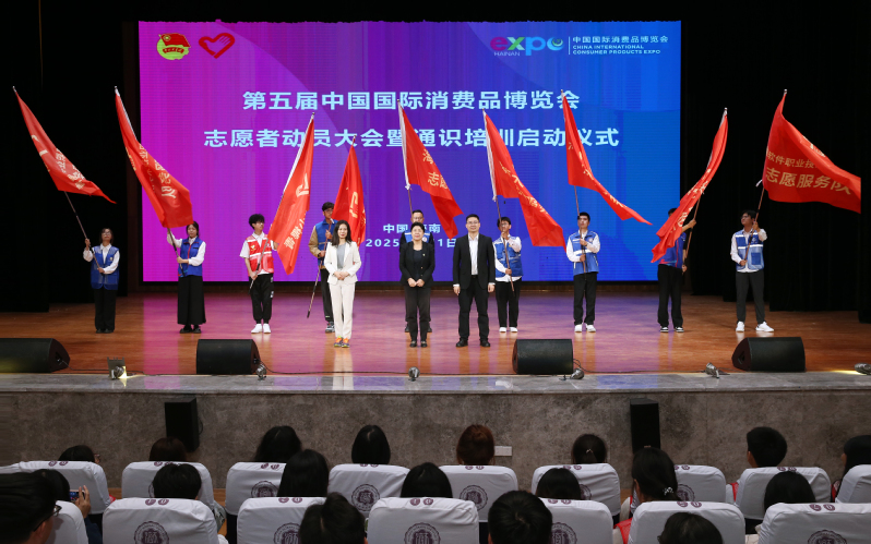 许玫、潘鸿、黄璀共同为志愿服务队授旗。全体志愿者起立宣誓,表达为消博会奉献力量的坚定决心。
