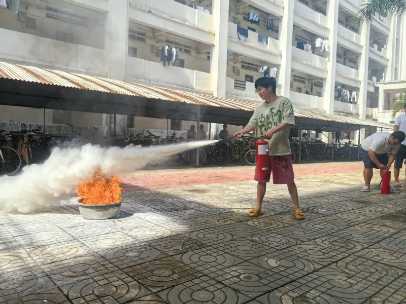 演练结束后,保卫处消防员以油盆火为模拟场景,现场演示灭火器“一提二拔三握四压”操作流程,并组织学生分批次进行实操。15个灭火器依次启用,明火被成功扑灭,演练取得成功。