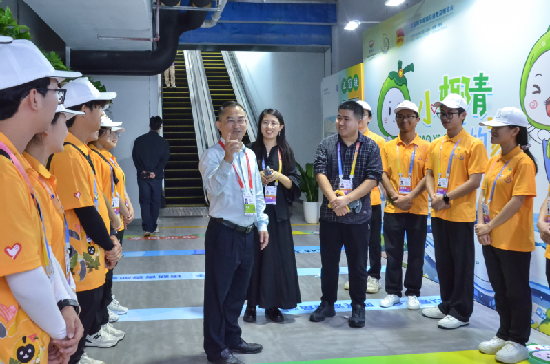 4月14日下午,校党委副书记符刘才在团委等部门负责人的陪同下来到海南国际会展中心,看望我校服务第五届消博会的“小椰青”志愿者。