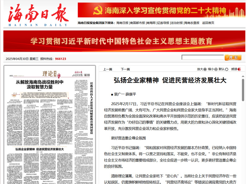4月22日、30日,《海口日报》和《海南日报》分别刊发我校裴广一教授的文章《以消博会为引领提振多元化消费需求》《弘扬企业家精神促进民营经济发展壮大》。文章充分肯定中国国际消费品博览会为提振消费信心、优化消费供给、畅通消费渠道创造的机遇,指出建设海南自贸港要把促进民营经济发展作为“办好自己的事情”的关键着力点,用更大的力度和决心深化关键领域改革开放,充分激发民营企业活力和企业家积极性。