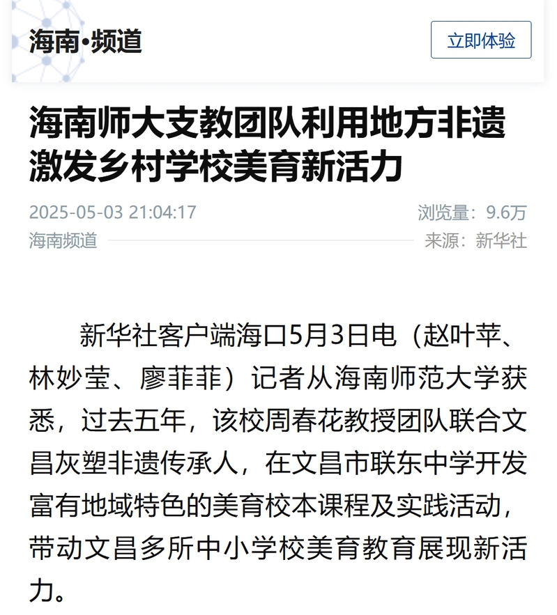 5月3日,新华社海南频道报道我校周春花教授团队联合文昌灰塑非遗传承人,在文昌市联东中学开发富有地域特色的美育校本课程及实践活动,带动文昌多所中小学校美育教育展现新活力。