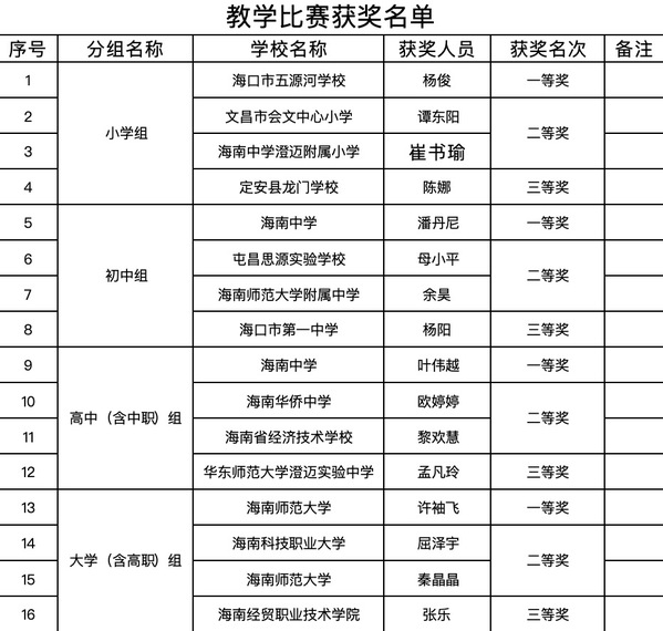 经过激烈角逐,海口市五源河学校杨俊获、海南中学潘丹尼、海南中学叶伟越、星空游戏官方许袖飞分别获得小学组、初中组、高中(含中职)组、大学(含高职)组一等奖,共12位选手入围2025年海南省大中小学思政课一体化“同题异构”教学比赛。