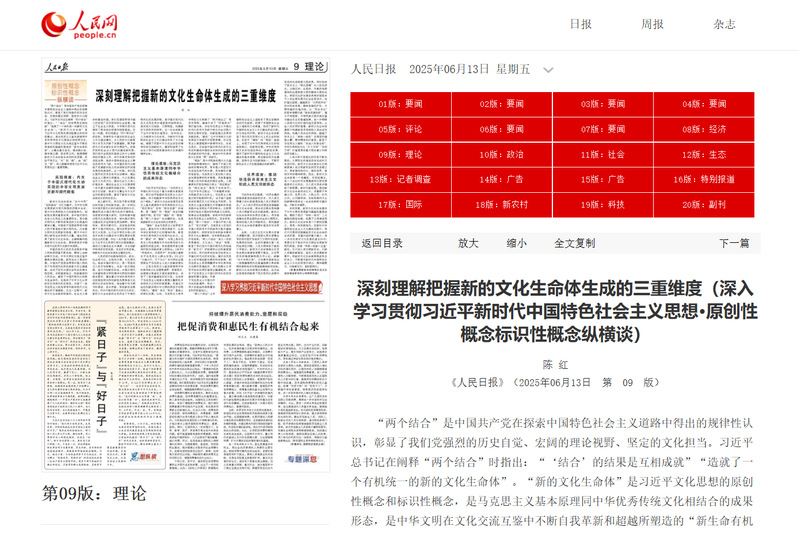 6月13日,人民日报报道我校陈红教授的文章《深刻理解把握新的文化生命体生成的三重维度》,文章从概念基点出发,循实践之迹、溯学理之源、答世界之问,梳理明晰新的文化生命体生成的内在逻辑,帮助我们从“点”到“线”、由“线”及“面”,深入理解和领悟习近平文化思想的这一重要范畴。
