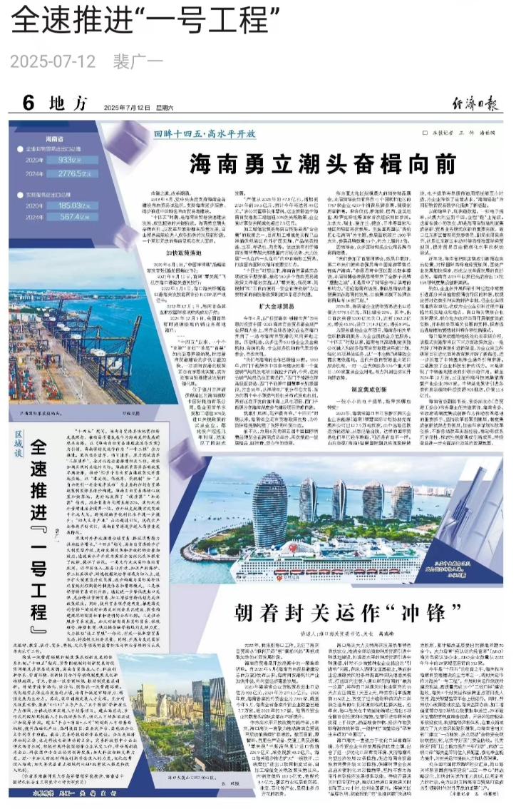 2025年7月12日,《经济日报》刊发我校裴广一教授文章《全速推进“一号工程”》。文章引起社会各界关注、得到众多平台全文转载,是星空游戏官方服务海南自贸港建设、助力“封关运作”的最新重要成果体现。