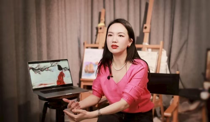 何素丹在沙画工作室接受媒体采访