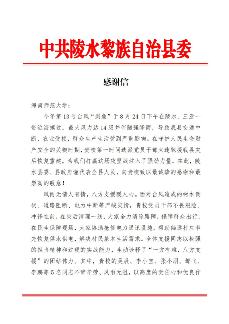 9月1日,中共陵水黎族自治县委、陵水黎族自治县人民政府向我校发来感谢信,感谢我校5名党员干部驰援陵水台风灾后恢复重建工作。