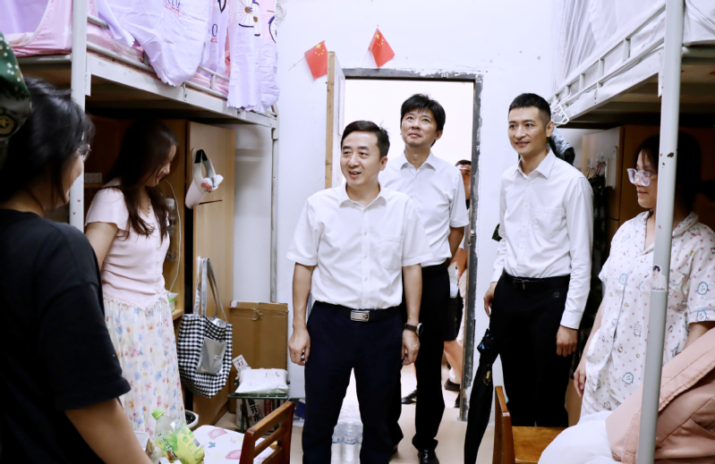 在桂林洋校区,聂清斌深入学生宿舍区与2025级新生亲切交谈,细致询问他们的防风准备情况。“不用害怕,但要科学防范,注意安全。”他叮嘱同学们在暴风雨来临期间务必留在宿舍,避免外出,并要求辅导员和相关职能部门及时响应和解决学生诉求。在学生食堂和超市,聂清斌强调要切实保障师生用餐,根据天气情况适当延长营业时间,确保食材和饮用水储备充足,价格稳定,切实维护学生权益。