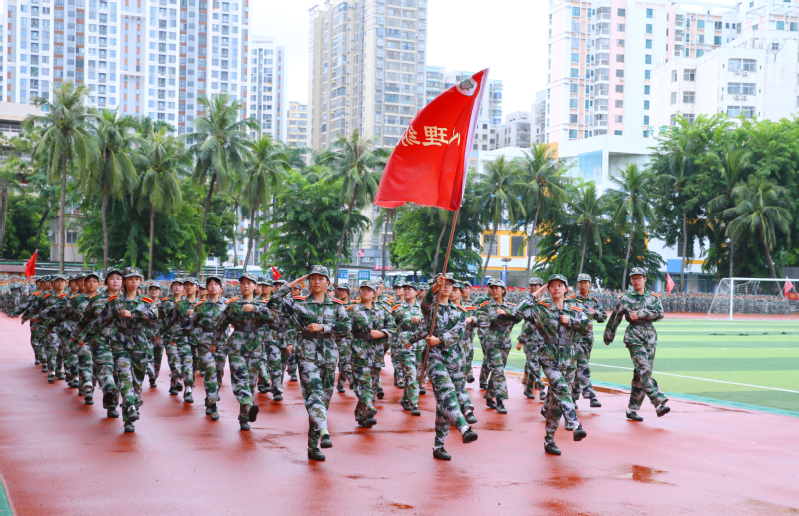 大会在庄严的升旗仪式中拉开帷幕。国旗护卫队步伐铿锵,升起鲜艳的五星红旗。分列式上,各连队方阵依次经过主席台,同学们身姿挺拔、步伐有力,口号响亮激昂,尽展蓬勃朝气与昂扬风貌。军事科目展示表演将现场气氛推向高潮:刺杀操方阵动作刚劲、气势如虹;匕首操方阵手持短刃,动作干净利落;百面战旗方阵旌旗猎猎,如烈焰翻腾;擒敌拳方阵拳风凌厉,势如破竹;战术方阵则以战斗队形展开演练,卧倒、匍匐、出枪一气呵成。同学们用专注的神情、熟练的动作和迷彩服上的汗水,向14天军训交出了满意的答卷。