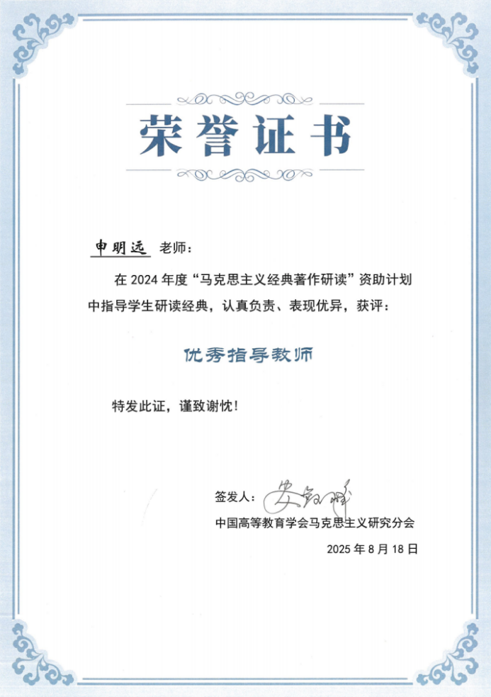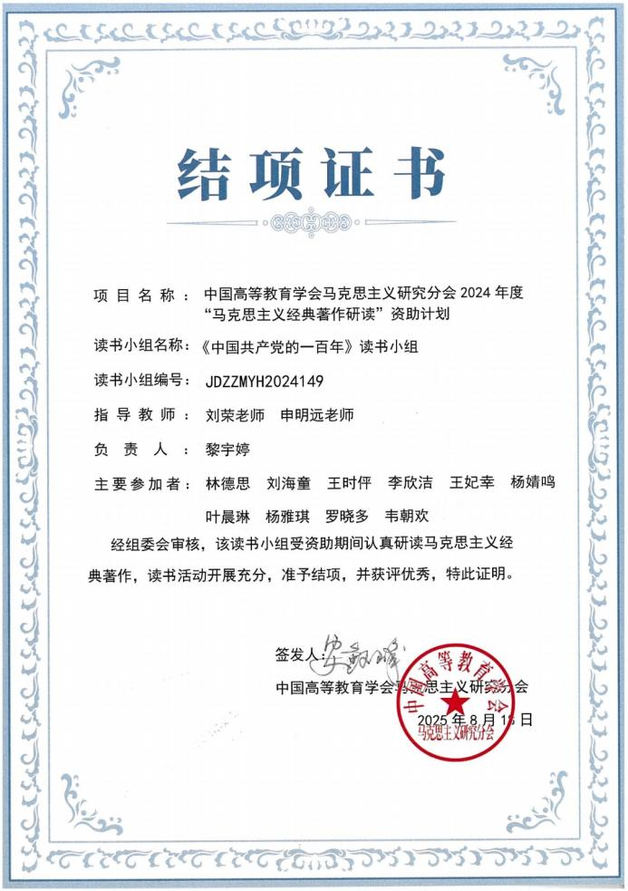 在近日结束的中国高等教育学会马克思主义研究分会2024年度“马克思主义经典著作研读”资助计划评选中,星空游戏官方《中国共产党的一百年》读书小组凭借卓越的表现与丰硕的成果,成功通过项目结项并荣获“优秀读书小组”称号,小组指导教师申明远荣获“优秀指导教师”。