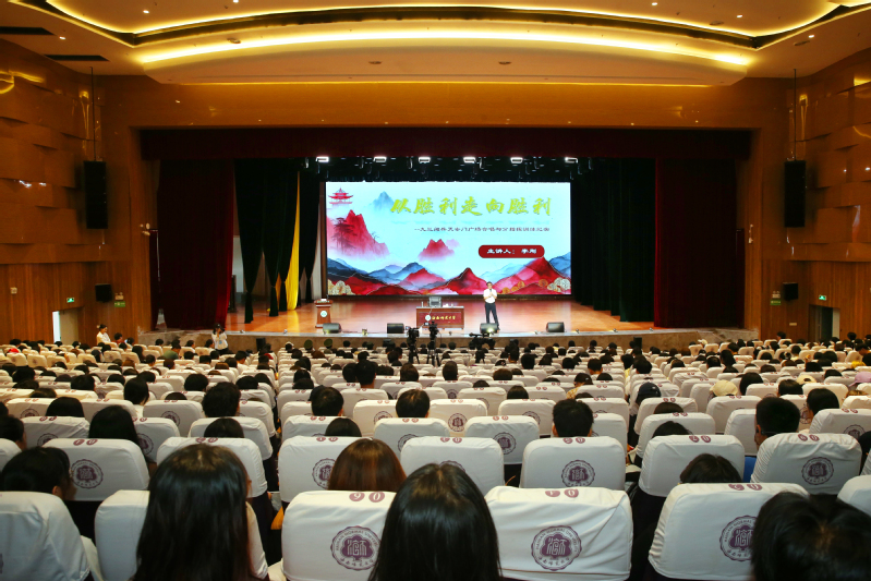 作为九三阅兵合唱的总指挥,李刚生动讲述了天安门广场阅兵合唱的庄严场景,揭秘了无伴奏合唱背后的艺术密码,分享3000人合唱训练的幕后故事,并邀请我校曾参与九三阅兵的学生郑思瑜登台。他将视角延伸至历史深处,以中国人民14年抗战光辉历程为主线,系统梳理了从东北抗联浴血奋战到全民族抗战众志成城,从平型关大捷振奋人心到抗日战争最终胜利举国欢腾的壮阔史诗,深刻解读“天下兴亡、匹夫有责的爱国情怀,视死如归、宁死不屈的民族气节,不畏强暴、血战到底的英雄气概,百折不挠、坚忍不拔的必胜信念”这一伟大抗战精神的丰富内涵。