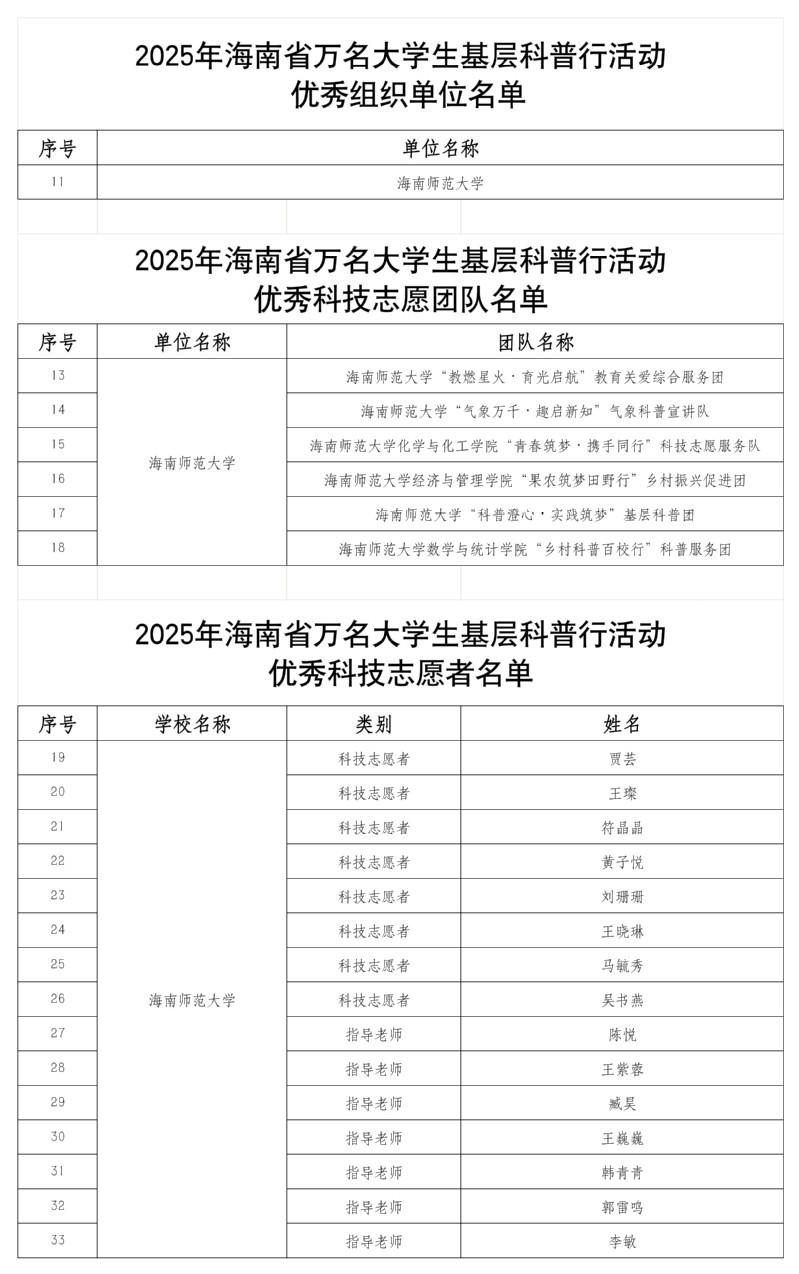 我校2025年海南省万名大学生基层科普行活动多项荣誉名单
