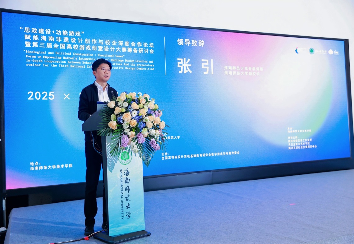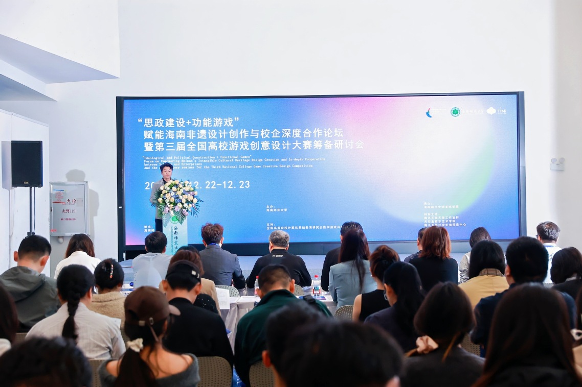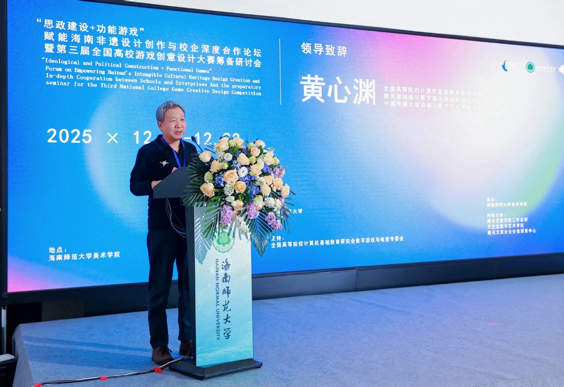 12月22日,“思政建设+功能游戏”赋能海南高校非遗设计创作与行业发展论坛暨第三届全国高校游戏创意设计大赛筹备研讨会在我校美术馆举行。校党委常委、副校长张引,全国高等院校计算机基础教育研究会会长黄心渊教授,教育部动画与数字媒体教指委委员淮永建教授,全国高等院校计算机基础教育研究会游戏与电竞专委会常务副主任邵兵教授出席研讨会开幕式。