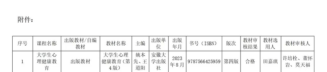 经教材选用人申请、教研室初审、学生处教材建设与管理工作小组审定等环节,确定《大学生心理健康教育(第4版)》教材为2025-2026学年第一学期大学生心理健康教育公共必修课程选用教材,现予以公示。公示期从7月7日至7月9日,在公示期间,对公示教材有异议,可致电0898-65883498向学生处反映。反映情况要实事求是,真实准确,有明确的具体内容。具体教材清单详见附件。